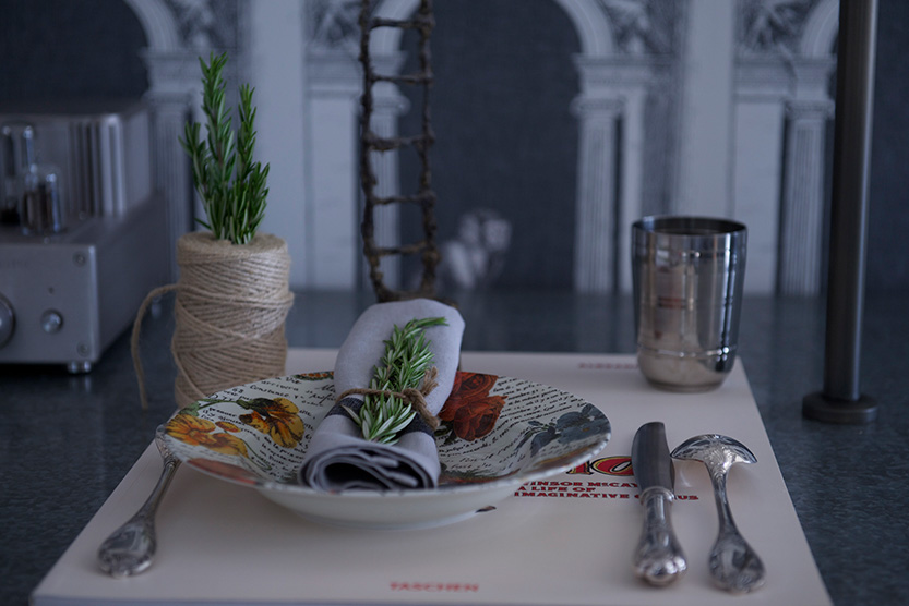 You would never get bored with Nadira’s creative tables! Nadira even uses books and magazines as placemats. Do not hesitate to add some herbs along the way such as tying a bouquet garni to the napkins!